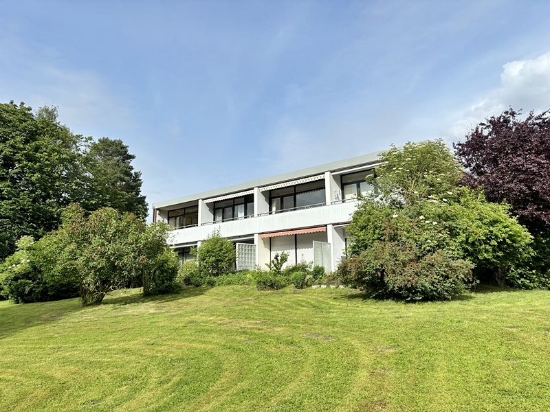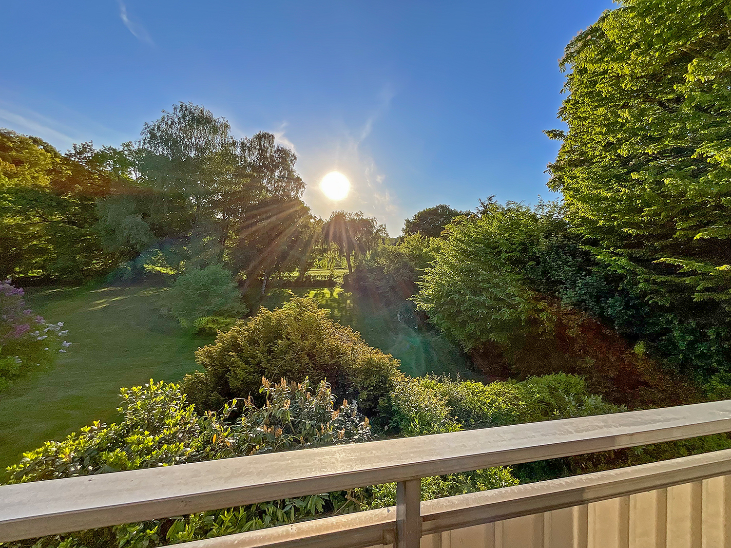 Ein großes Highlight ist der sonnige Balkon mit Blick ins parkähnliche Grundstück inklusive Teichanlagen und altem Baumbestand.
