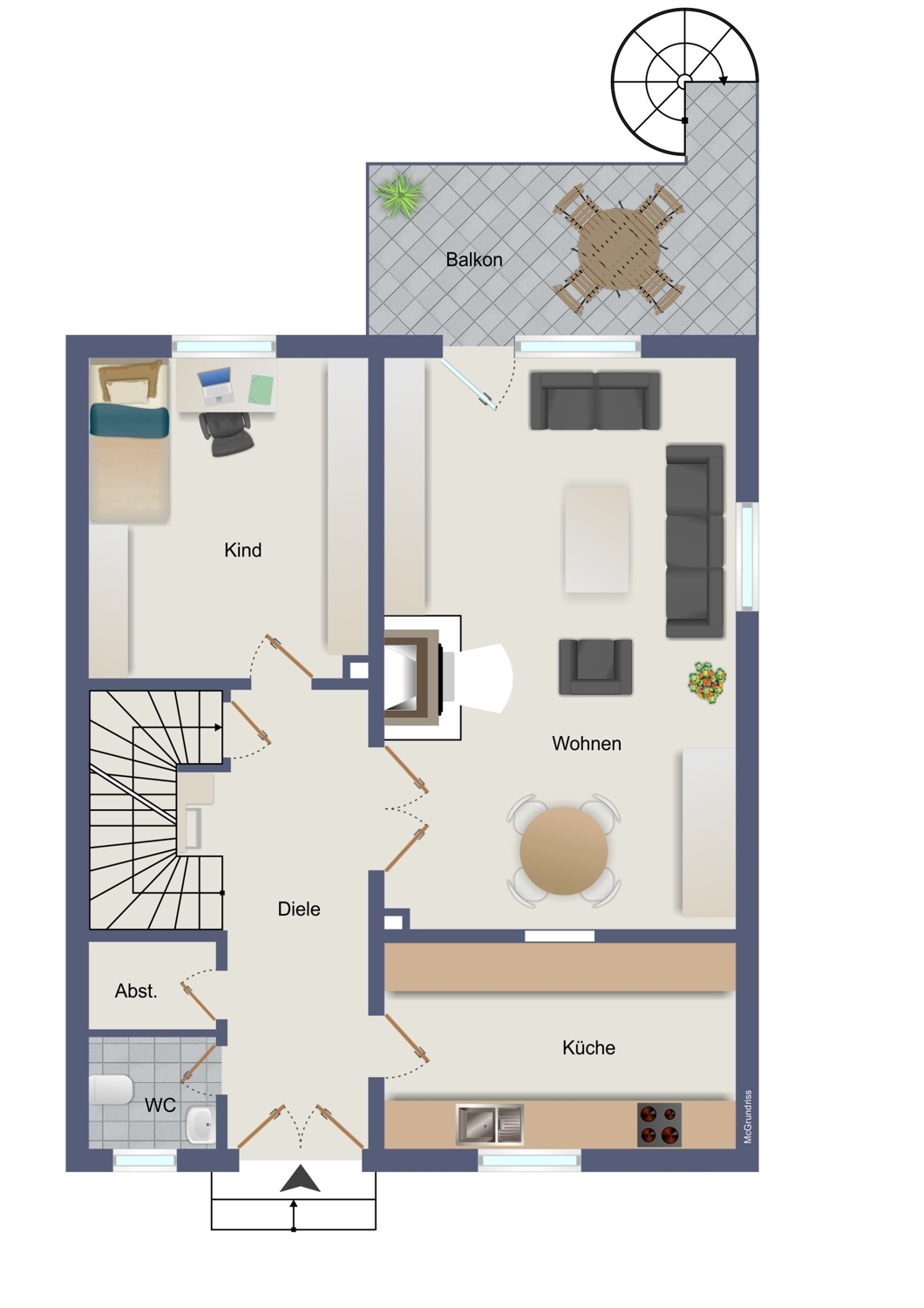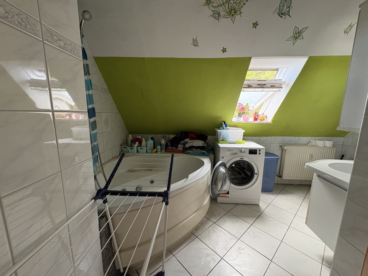 Die Hauptwohnung verfügt über 4 Zimmer, zwei Tageslichtbäder, sowie ein separates Gäste-WC. Der ausgebaute Dachboden bietet einen weiteren Raum.