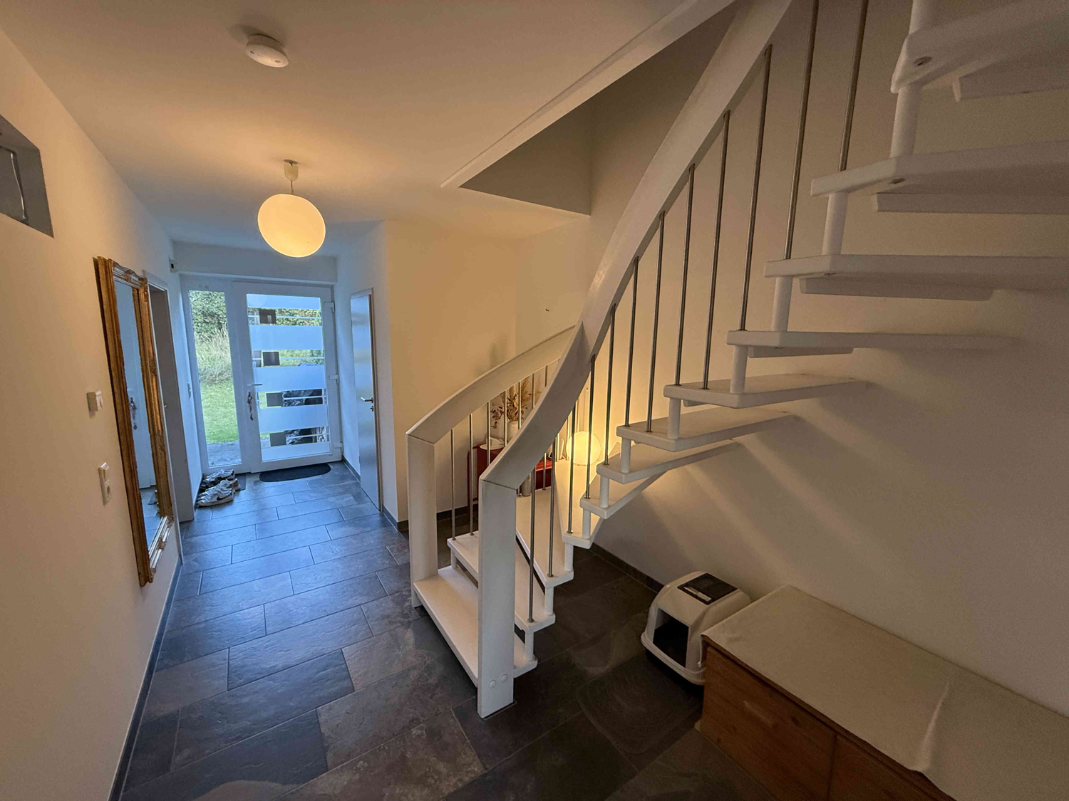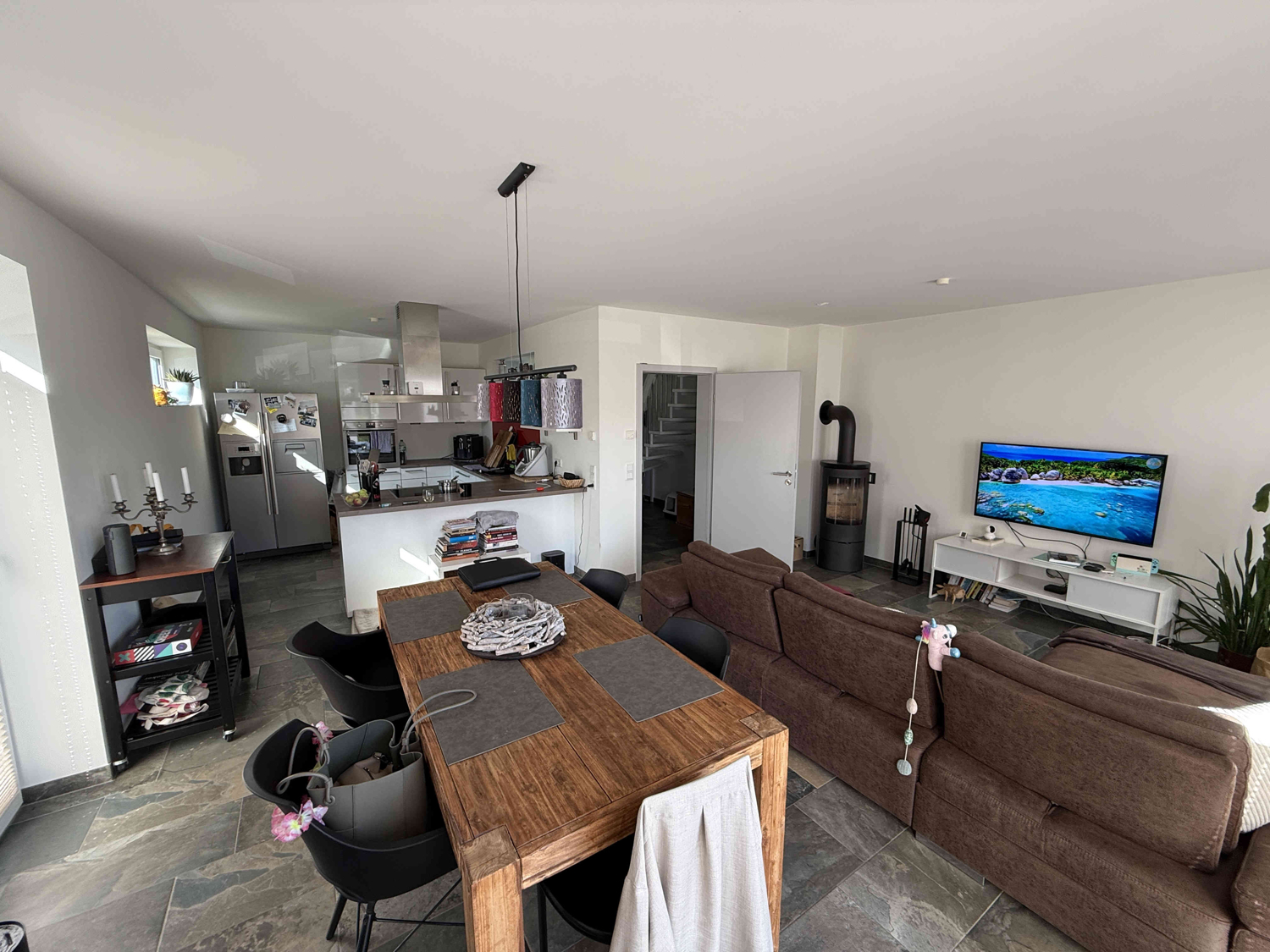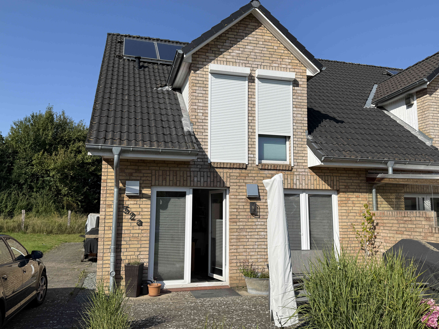 Diese ansprechende Doppelhaushälfte aus dem Jahr 2012 überzeugt durch ihre moderne Bauweise, energieeffiziente Ausstattung und eine durchdachte Raumaufteilung. Mit ihrem KfW-55-Standard, einer Lüftungsanlage mit Wärmerückgewinnung sowie Solarthermie zur Warmwasserbereitung bietet das Haus nicht nur zeitgemäßen Wohnkomfort, sondern auch nachhaltige Energienutzung und niedrige Betriebskosten.Im Erdgeschoss empfängt Sie ein großzügiger Flur, von dem aus alle Räume zugänglich sind. Hier befinden sich ein Hauswirtschaftsraum, ein Gäste-WC sowie das Herzstück des Hauses, der offen gestaltete Wohn- und Essbereich mit gemütlichem Kamin und offener Küche. Große Fensterflächen sorgen für viel Tageslicht und schaffen eine angenehme Wohnatmosphäre. Vom Wohnbereich aus gelangen Sie direkt auf die schöne Terrasse, die zum Entspannen und Verweilen einlädt, sowie in den gepflegten Garten, der ausreichend Platz für Freizeit, Spiel und Erholung bietet.