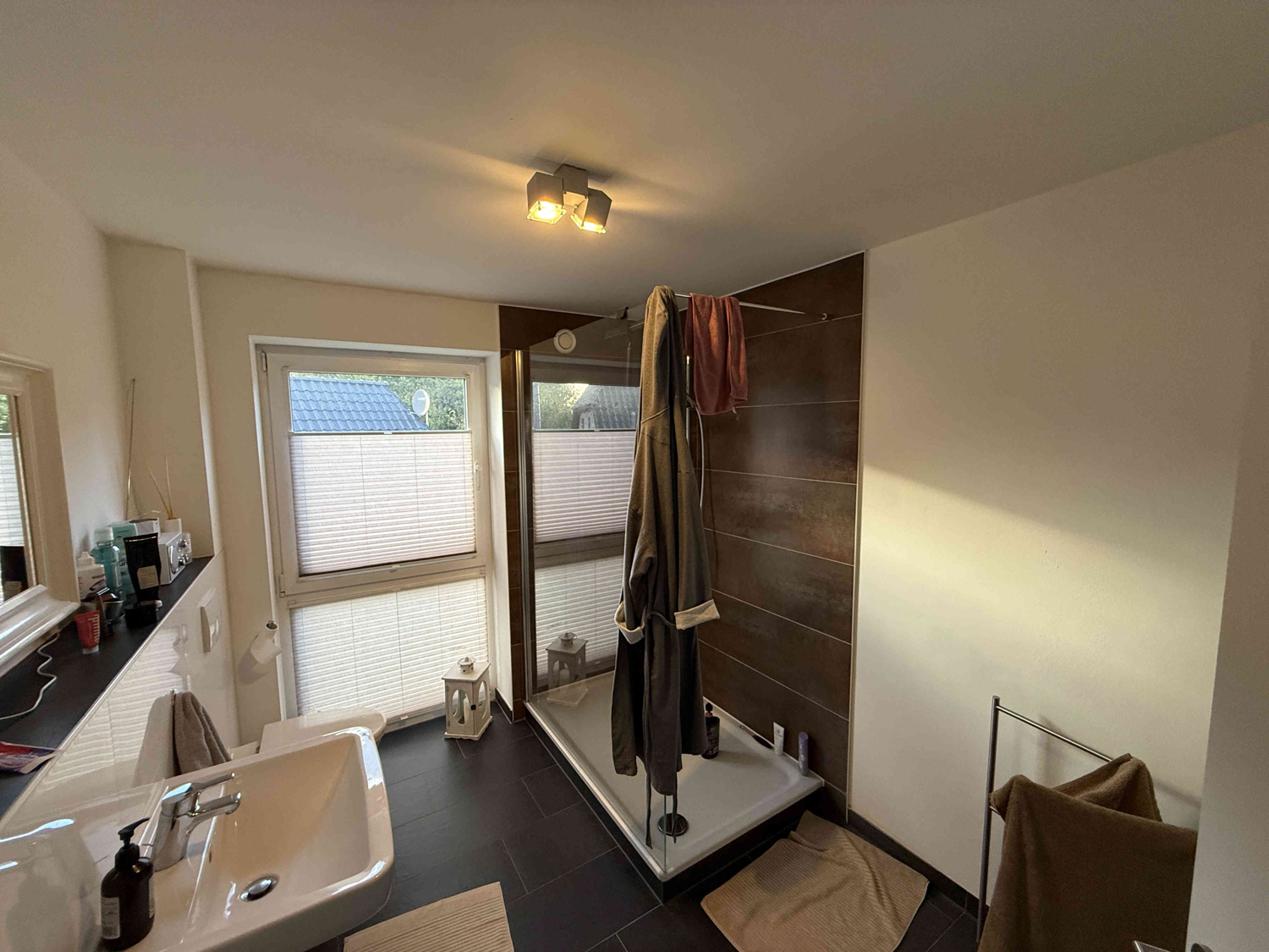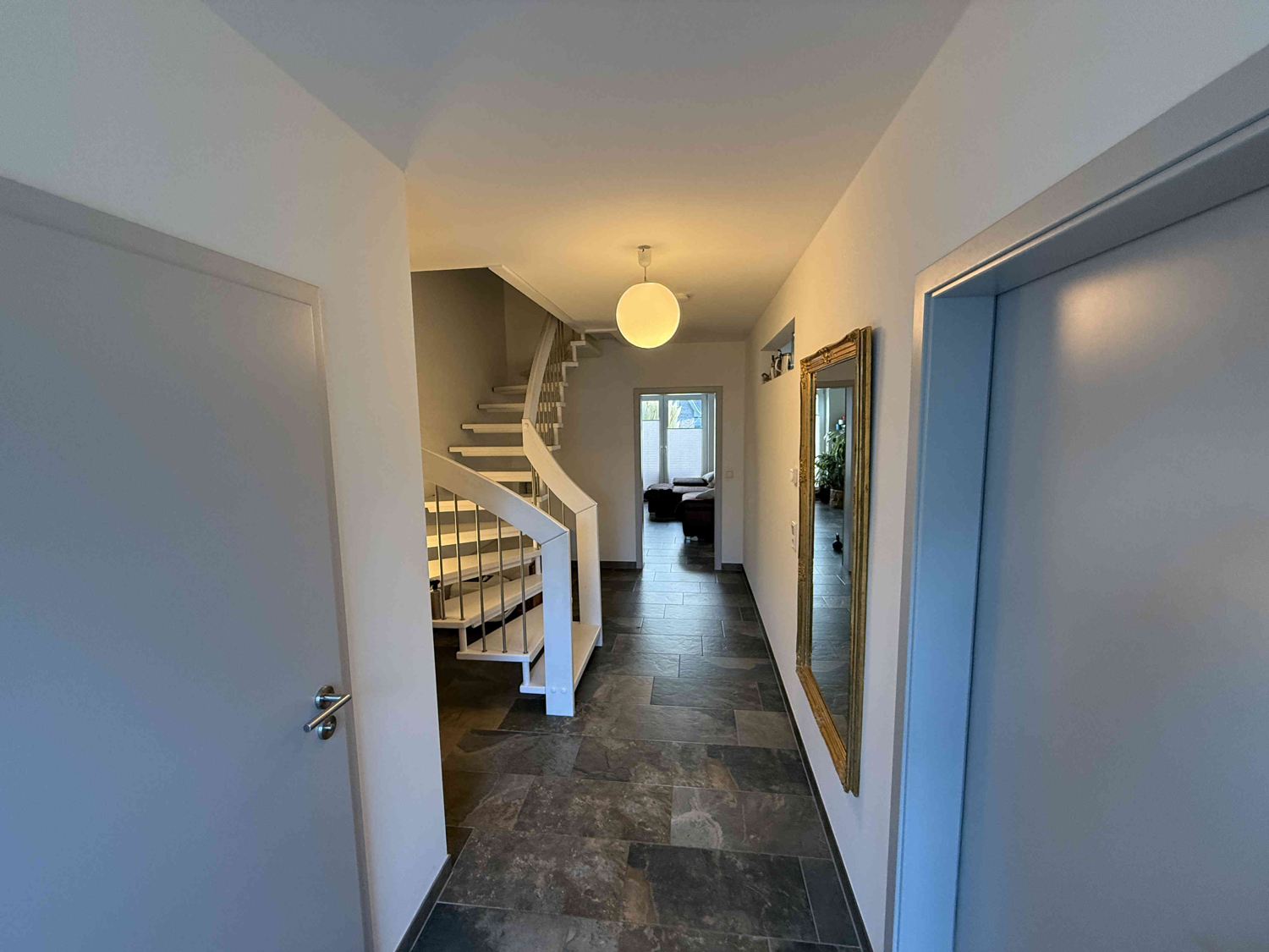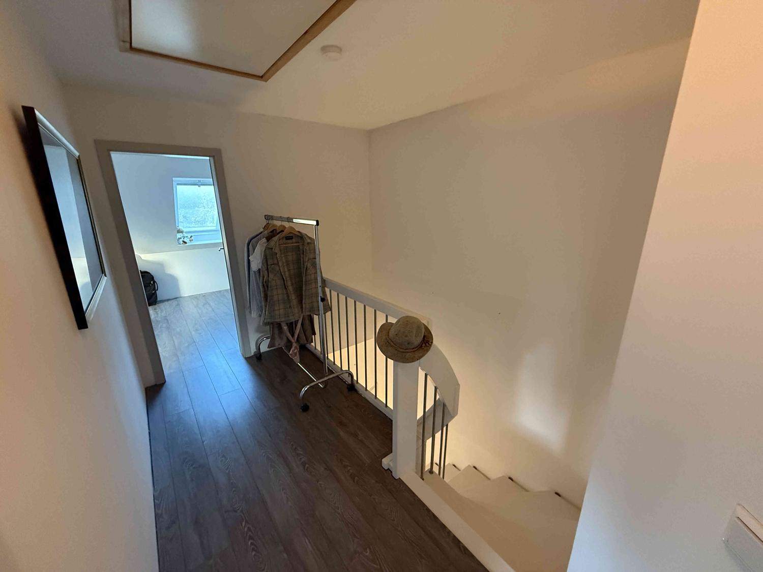 Über die Treppe im Flur gelangen Sie ins Obergeschoss, das mit drei Schlafzimmern ausreichend Platz für Familie, Gäste oder ein Homeoffice bietet. Das moderne Badezimmer ist mit einer großen Dusche und hochwertigen Sanitärelementen ausgestattet.