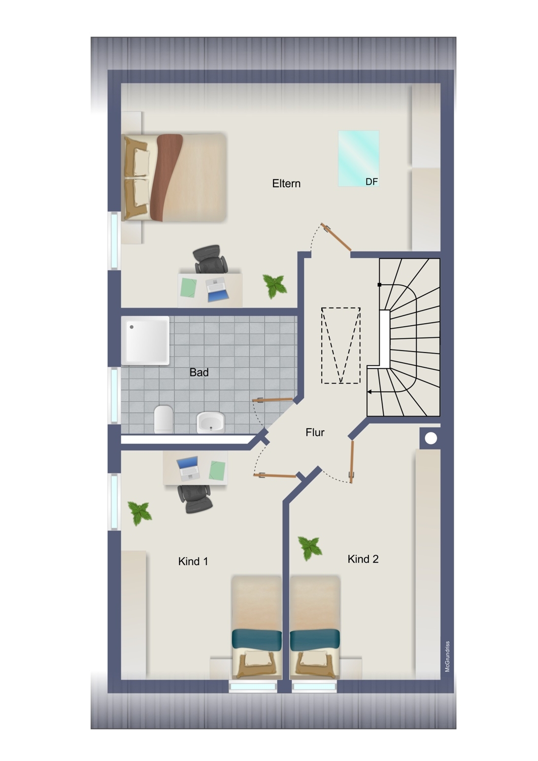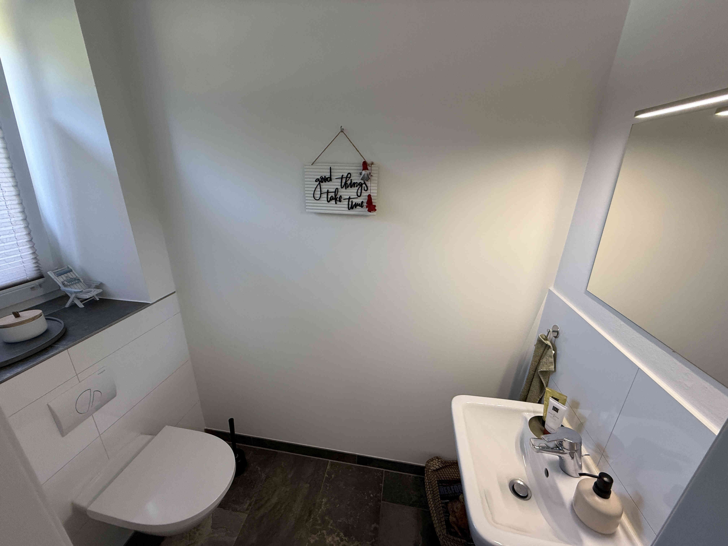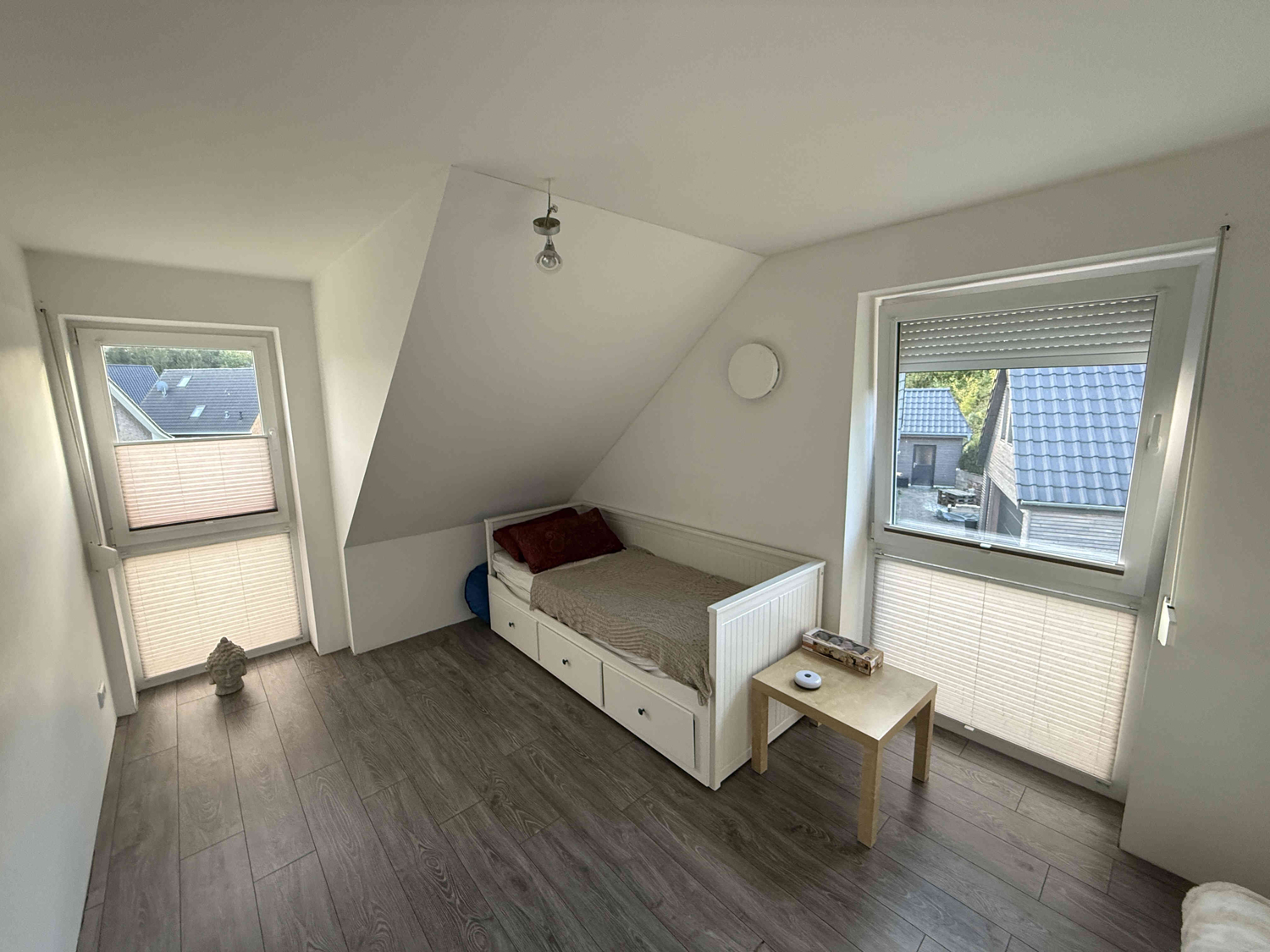 Über die Treppe im Flur gelangen Sie ins Obergeschoss, das mit drei Schlafzimmern ausreichend Platz für Familie, Gäste oder ein Homeoffice bietet. Das moderne Badezimmer ist mit einer großen Dusche und hochwertigen Sanitärelementen ausgestattet.
